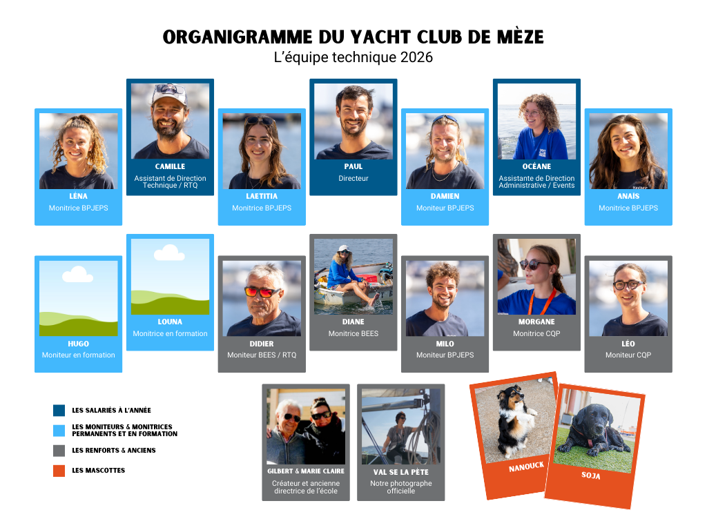 L’équipe salariée de l’école de voile, en charge de la mise en oeuvre technique, est composée d’une quinzaine de personnes présentes à l’année ou ponctuellement.